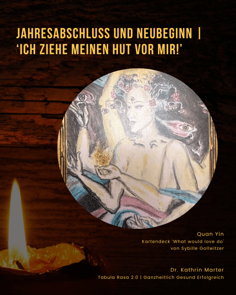 Heute und mit Quan Yins Unterstützung bist du herzlich eingeladen, dich tief vor dir selbst zu verbeugen für alles, was du in diesem Jahr erlebt und geschafft hast und auch vor dem, was du dir vielleicht vorgenommen und nicht geschafft hast. Gib es an Quan Yin ab.