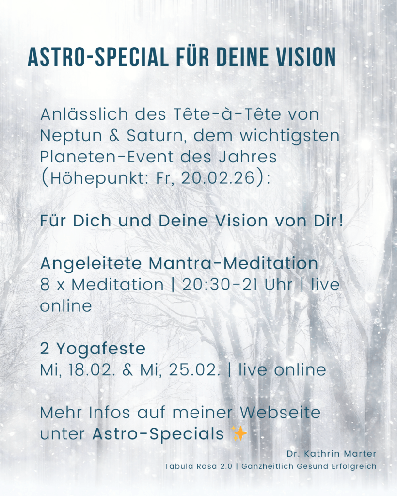 Der Jahresbeginn, das ler-Jahr, die Abenteurerin (Monatsunterstützerin im Januar), das Sonnenzeichen des Februars; der Wassermann und die anstehende Konjunktion von Neptun (Visionen) und Saturn (Tatkraft) laden mit voller Kraft dazu ein, die eigene Zukunft ins Visier zu nehmen.