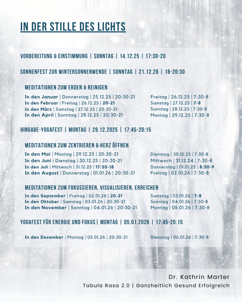 - Ankommen & Reinigen (Rauhnächte 1-4) mit Start der Meditationen am Donnerstagabend, dem 25.12.25 (Rauhnacht in den Januar) von 20:30-21 Uhr.